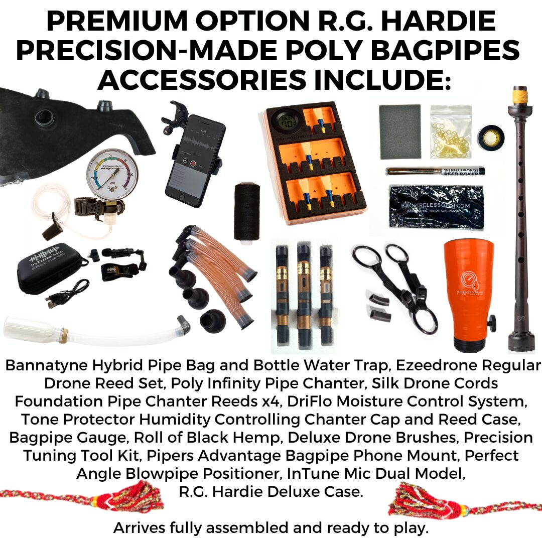- Premium: Everything in Sticks Only and Basic and also Foundation Pipe Chanter reed x4 (total), DriFlo Moisture Control System, Tone Protector Humidity Controlling Chanter Cap, Bagpipe Gauge, Tone Protector Reed Case, Roll of black hemp, Deluxe Drone Brushes, Precision Tuning Tool Kit, Pipers Advantage Bagpipe Phone Mount, Perfect Angle Blowpipe Positioner, InTune Mic: Wireless Clip-on Instrument Microphone Dual, R.G. Hardie Deluxe Case. Fully assembled and ready to play.