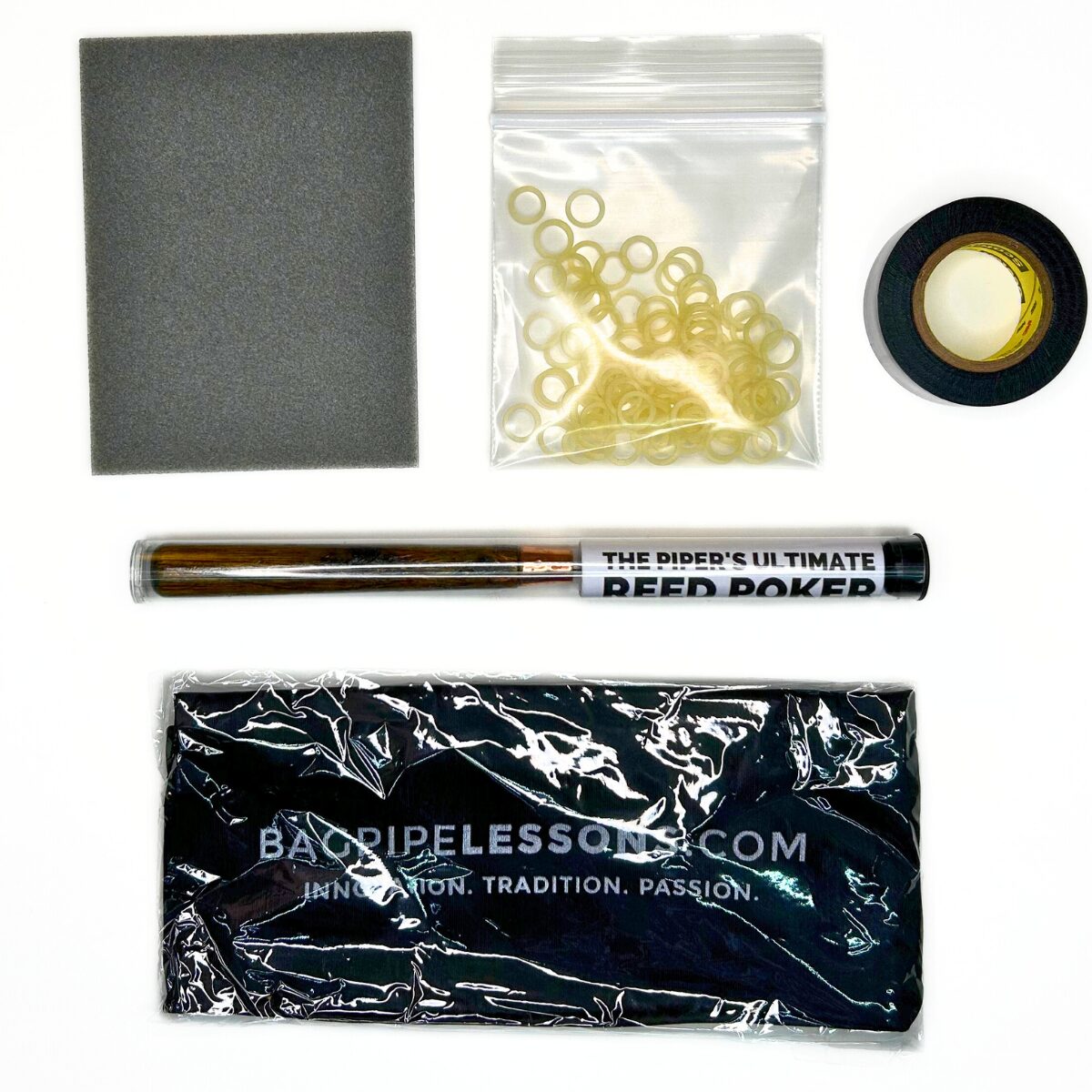 The kit includes everything you need: Piper’s Ultimate Reed Poker for enhancing reed stability, Professional Grade Elastic Chanter Reed Bridles for adjustable strength, Precision Soft-Foam Chanter Reed Sanding Pad for optimal vibration, High-Performance Chanter Tuning Tape for precise note tuning, and a stylish BagpipeLessons.com Signature Microfiber Pouch to keep everything organized. Elevate your piping experience with tools that keep your pipes in tune and easy to play, allowing you to focus on your music and performance.
